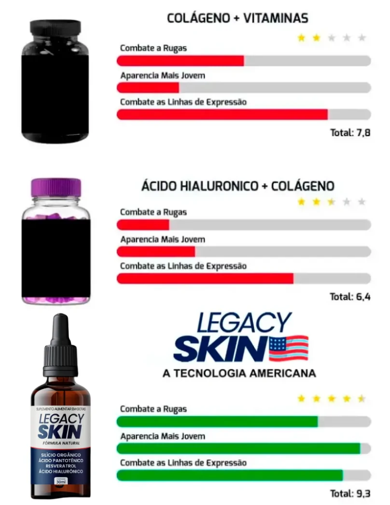 O Legacy Skin é o único suplemento brasileiro com uma fórmula líquida e ultra concentrada que atua diretamente na raiz desse processo de envelhecimento.